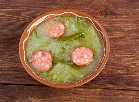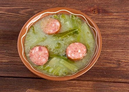 Bata os ingredientes no liquidificador, exceto a calabresa e a couve. Doure a linguiça, acrescente ao caldo e leve ao fogo até levantar fervura. Adicione a couve manteiga e sirva.