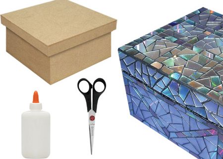 O passo a passo é bem simples: basta cortar o CD em diversas partes e depois colar na caixa com o lado metalizado para cima, criando um mosaico. Você também pode usar a técnica para decorar outros objetos, como molduras de espelhos e quadros.