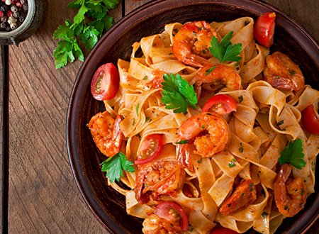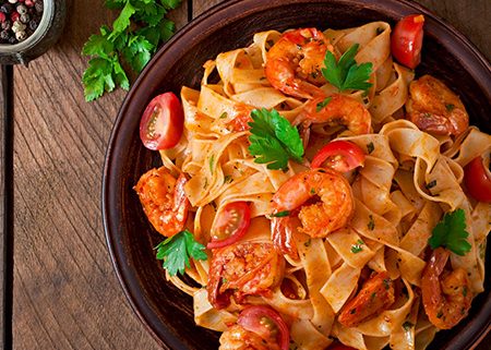 Modo de preparo: Ferva meia panela de água e cozinhe a massa. Tempere os camarões e grelhe no azeite. Coloque um pouco mais de azeite na frigideira, adicione o alho e deixe dourar. Acrescente o suco e a manteiga, e mexa até que derreta por completo. Volte com o camarão, mexa bem e misture à massa já cozida.