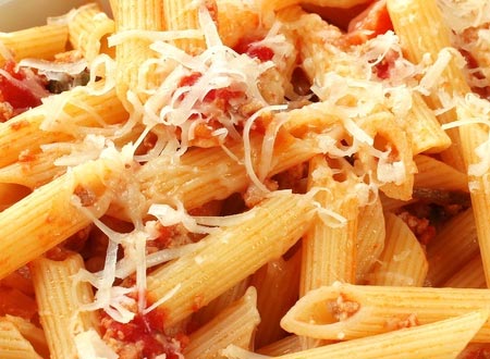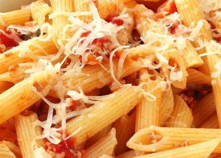 Em uma panela de pressão, adicione os quatro copos de água, deixe esquentar e acrescente o macarrão. Mexa para não grudar e coloque o molho. Tampe e deixe pegar pressão. Após três minutos, tire a pressão, passe para um refratário e misture o creme de leite. Salpique o queijo ralado e sirva quente.