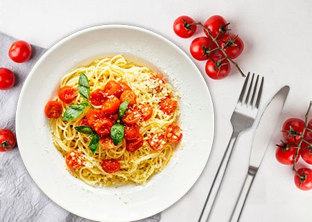 Cozinhe o macarrão e reserve. Aqueça o azeite, adicione o manjericão e mexa bem. Em seguida, acrescente os tomates, a mussarela, o sal e o macarrão. Quando o queijo começar a derreter, retire do fogo. Acrescente algumas folhas de manjericão por cima e sirva.
