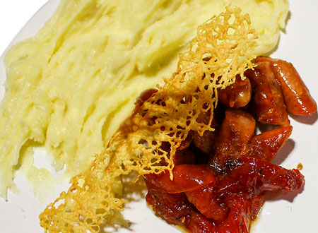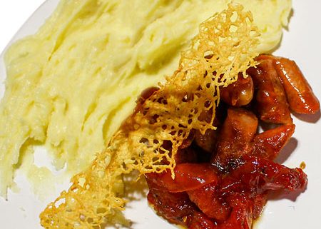 Descasque e cozinhe as batatas. Assim que cozidas, escorra a água e amasse-as, com um pouco de manteiga. Na hora de servir esquente o purê e misture o queijo. Mexa até estar homogênea e sirva em seguida enquanto quente.