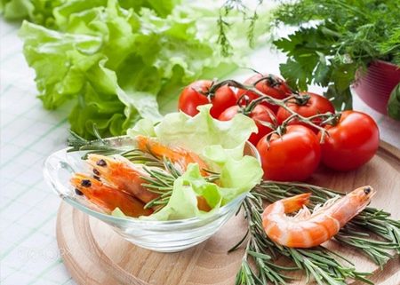 Forme um círculo com a alface e preencha com os tomates e palmitos picados e o camarão cozido. Tempere com sal, limão e azeite.