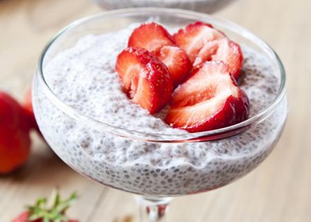 Bata o leite de coco, as tâmaras e a baunilha no liquidificador. Coloque em uma tigela, adicione a chia e misture com uma colher. Deixe na geladeira por uma hora e sirva com os morangos fatiados.