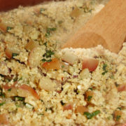 Após descascá-los, rale a cebola e pique o alho. Em uma panela aqueça o azeite e doure a cebola e o alho picados com uma pitada de sal. Acrescente as frutas secas e as nozes e mexa por um minuto, em fogo baixo. Adicione a farinha e mexa sem parar por dois minutos.