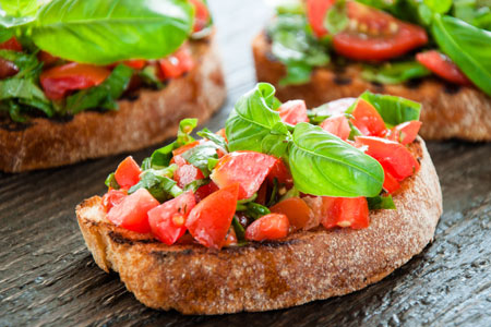 Deixe os tomates escorrendo em uma peneira de um dia para o outro ou até que percam a água. Transfira para uma tigela e junte com o azeite de oliva, o aceto balsâmico e o sal e misture. Adicione a mistura em cima de torradas e finalize com as folhas de manjericão.